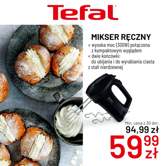 Mikser ręczny Tefal łączy wysoką moc (300W) z kompaktowym designem. Wyposażony w dwie końcówki ze stali nierdzewnej: do ubijania i wyrabiania ciasta. Idealny do szybkiego przygotowywania deserów i domowych wypieków.