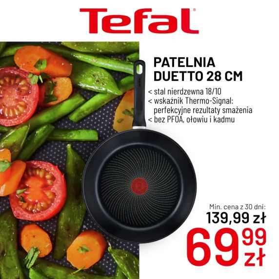 Patelnia Tefal Duetto 28 cm wykonana jest ze stali nierdzewnej 18/10. Dzięki wskaźnikowi Thermo-Signal uzyskasz perfekcyjne rezultaty smażenia. Produkt jest bezpieczny dla zdrowia – nie zawiera PFOA, ołowiu i kadmu.