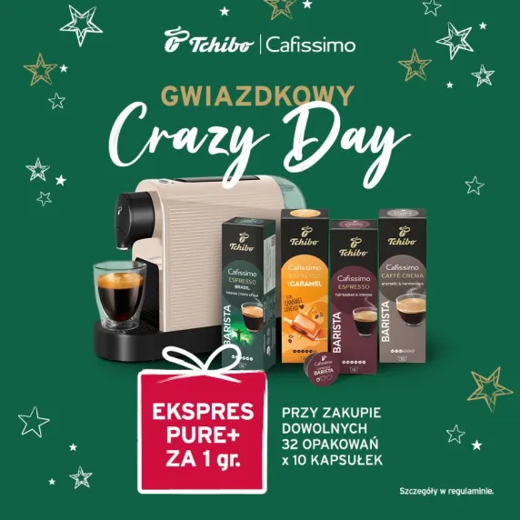 Chcesz mieć najlepszą kawę ekspresowo? Teraz dostaniesz ekspres Cafissimo PURE+ za 1 grosz przy zakupie 32 opakowań kapsułek! Odwiedź sklep Tchibo i skorzystaj z promocji. Szczegóły w regulaminie.