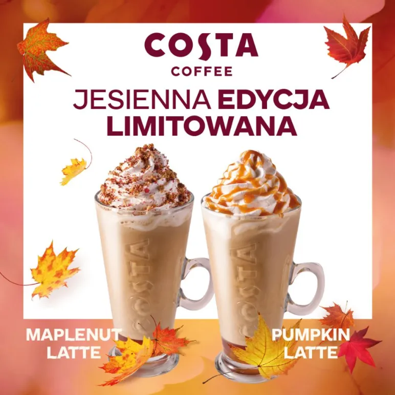 Jesień zawitała do Costa Coffee! Pumpkin Latte z dyniowym puree i korzennymi przyprawami oraz Maplenut Latte z nutą syropu klonowego i delikatnym orzechowym akcentem to smaki, które wprowadzą Cię w wyjątkowy jesienny klimat. Wpadnij i odkryj swoją Jesień w filiżance!