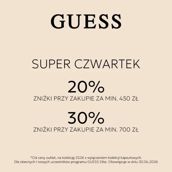 *Od ceny outlet, na kolekcję SS26 z wyłączeniem kolekcji kapsułowych. Dla obecnych i nowych uczestników programu GUESS Elite.